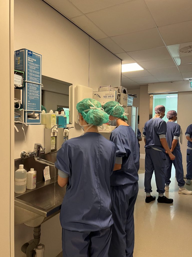 Iedereen moest zich voorafgaand omkleden waarna we een rondleiding kregen op het OK complex onder leiding van twee chirurgen en twee OK-assistenten. Ook werd er uitleg gegeven over handhygiëne en moesten de leden natuurlijk hun handen wassen.